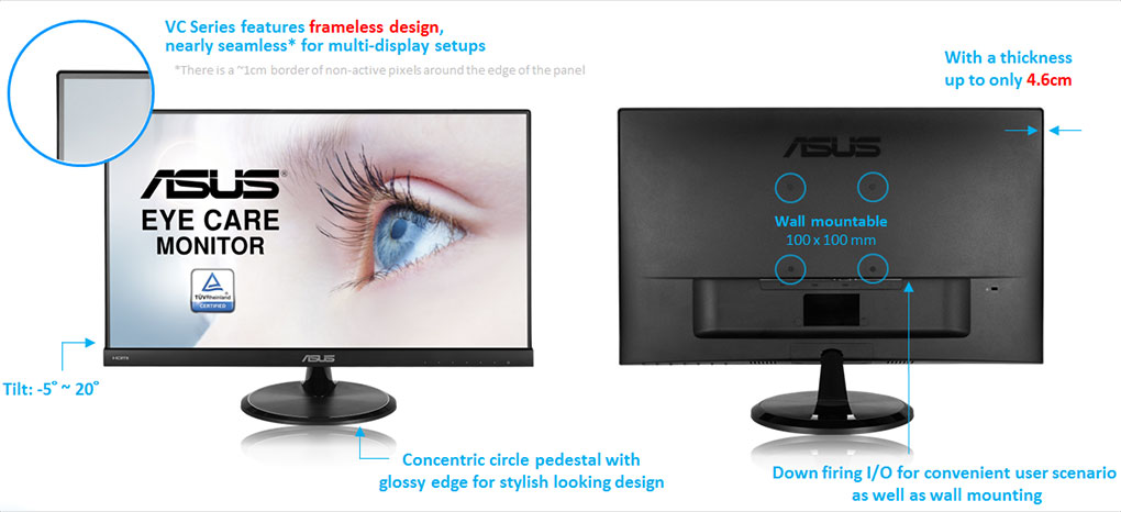 مانیتور VC239HE با سایز 23 اینچ و رزولوشن Full HD (1920 ×1080) در دو رنگ سفید و مشکی طراحی شده است. همچنین با فن آوری مراقبت از چشم ASUS از چشم های خود محافظت کنید.